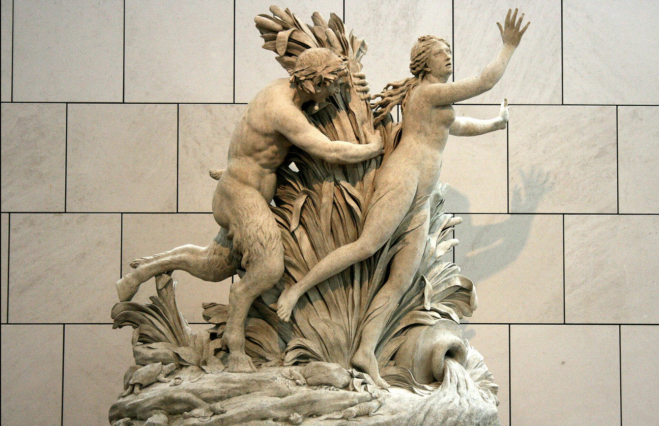 Pan's most famous love story is the one with the nymph Syrinx. When Syrinx transformed herself into reeds to escape Pan's passionate courtship, Pan made his famous pipe, the syrinx, the Pan flute, from these reeds. So even rejection gave birth to a new creation. Pan's libido is as productive as it is destructive, just like the artist's creative urge.