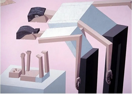 Everyone who looks at Mernet Larsen's paintings asks this question. Block-like figures, flattened perspective, pixelated colors... They seem to belong to the 2020s.