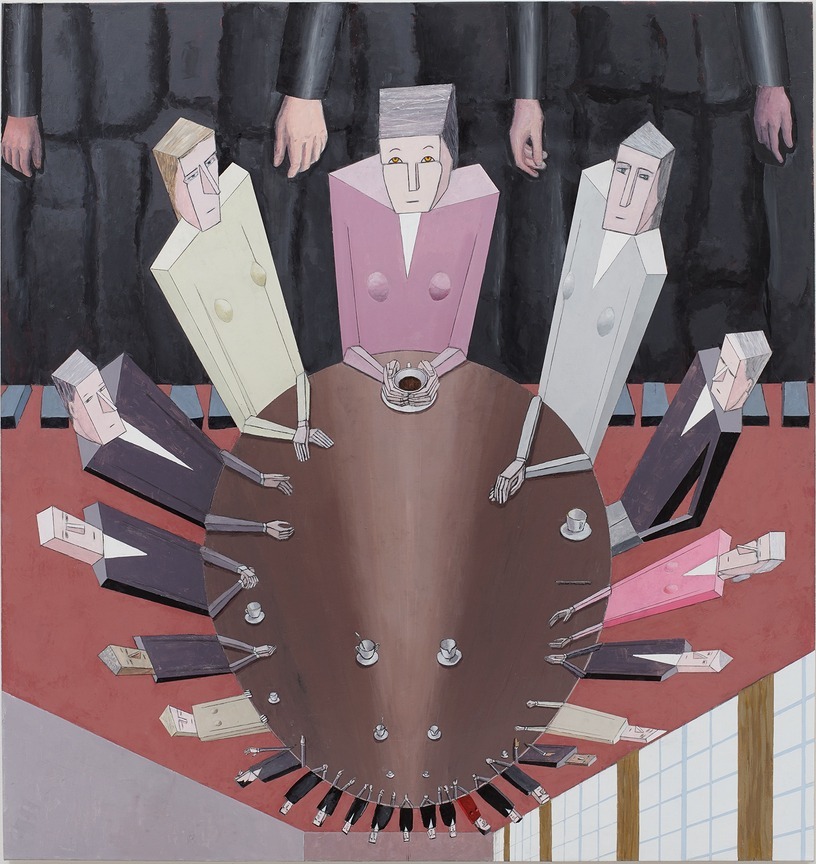 The real breakthrough came in her 70s, during a boring faculty meeting. "Why has no one ever painted a faculty meeting?" she thought. Then: "What if I were the vanishing point?" In classical perspective, what's near is large, what's far is small. Larsen reversed it. Taking Notes (2004): Figures approaching the viewer are small. Illogical but consistent. Committee (2007): The U-shaped table forced the space, so she opened it up. The floor also became the ceiling. Tiles are both near and far. Not natural but completely rational.