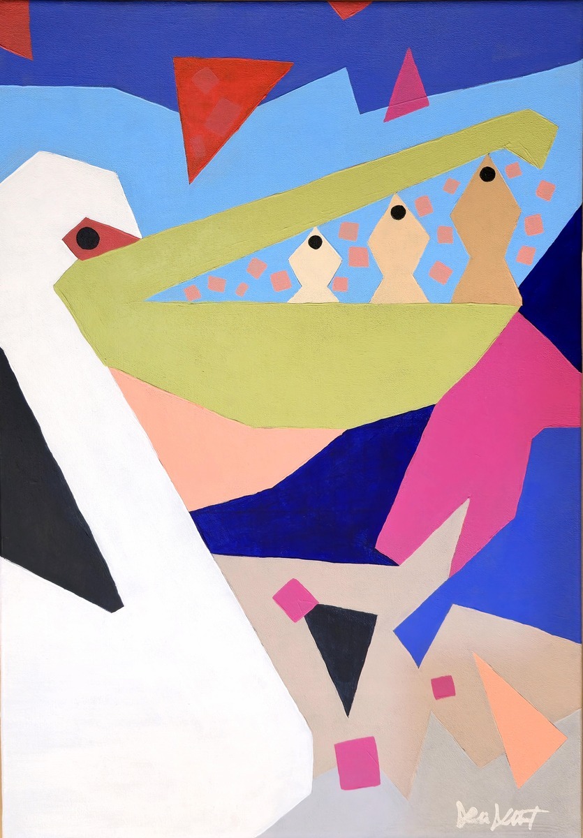 Fisher serisinde, sarı-yeşil tonlarında soyutlanmış bir pelikan gagası tuvali merkeze alır. Gagadaki üç balık figürü bej ve krem baklava formlarıyla figüratif gerçekliğin geometrik dile en saf çevirilerinden birini sunar. Çevredeki koyu mavi, kırmızı üçgenler ve pembe kareler ise deniz, güneş ve rüzgârın izlenimsel karşılıkları olarak işlev görür. Sanatçının kolaj estetiğinden beslenen keskin kenar geçişleri, görüntünün anlık bir fotoğraf karesinden çok, belleğin yeniden kurduğu bir sahne olduğunu hissettirir.