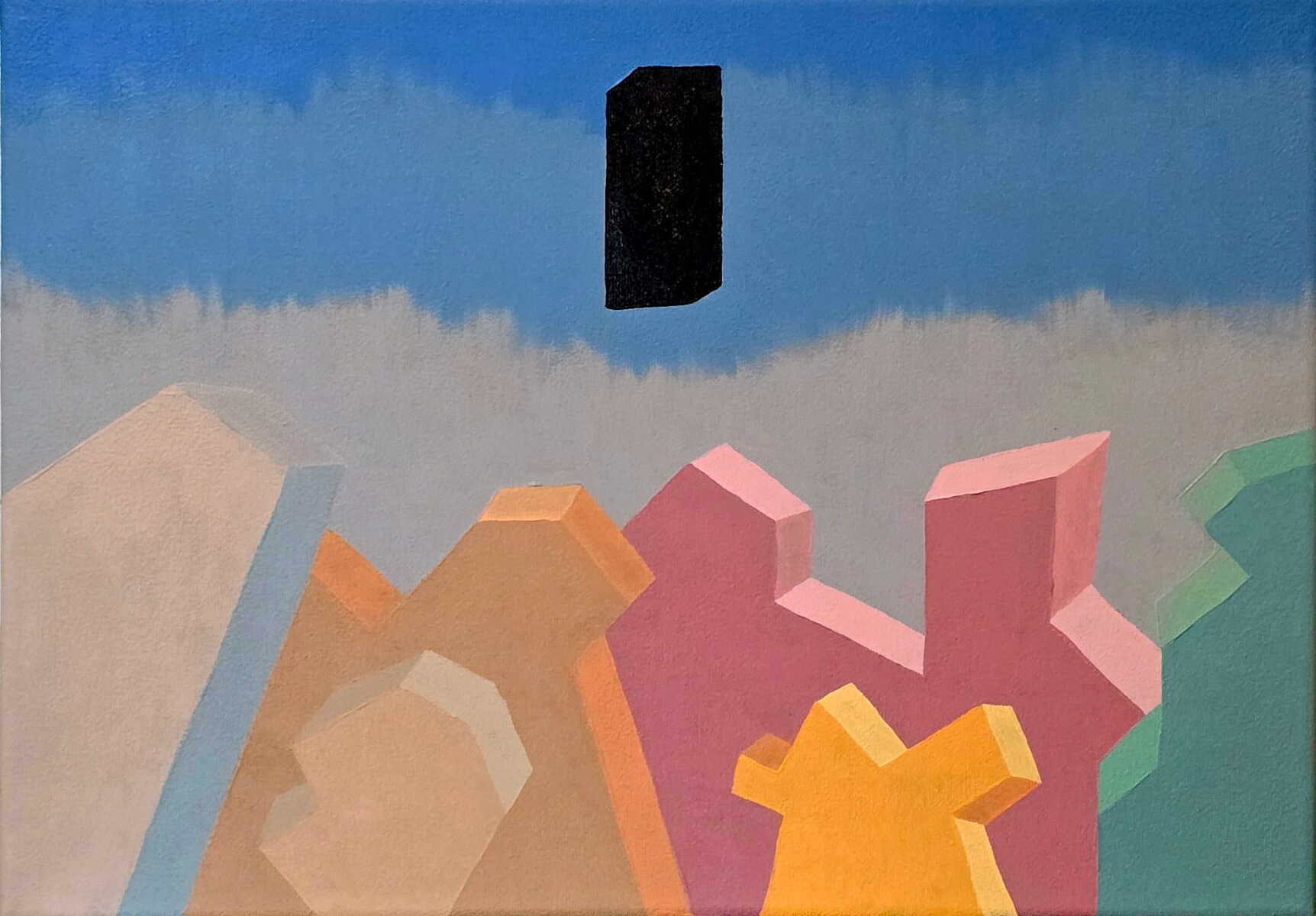Odyssey Gökyüzünde asılı kalan siyah monolit, pastel kristallerin arasından yükselen sessiz bir çağrıya dönüşür; Altınel burada Kubrick'in ikonik imgesiyle mimari kütle ilişkisini aynı düzlemde buluşturarak, bilinen ile bilinmeyenin eşiğinde bir gerilim kurar.